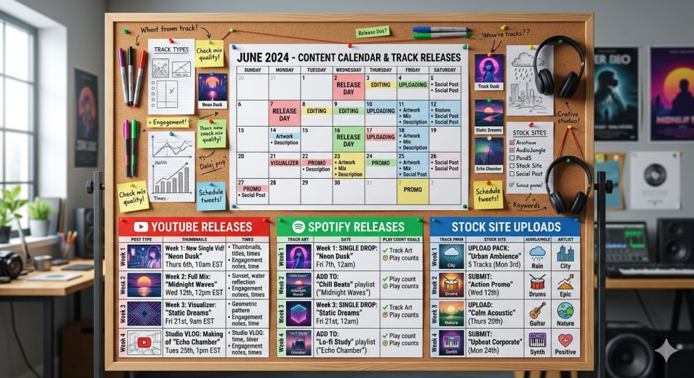 Monday: Generate 10–15 tracks in your niche using Suno. Download the best 5–6.