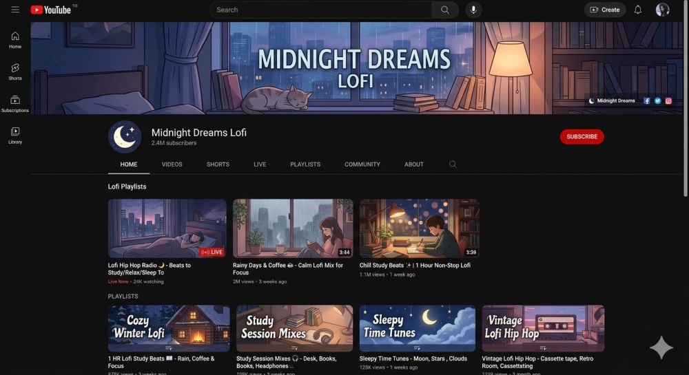This is, without question, the fastest path to meaningful AI music income for most beginners. Here’s why: YouTube pays through ad revenue (not just streams), and the lofi/ambient/study music niche has a massive, loyal audience that watches for hours at a time. Long watch sessions = more ads = more money.