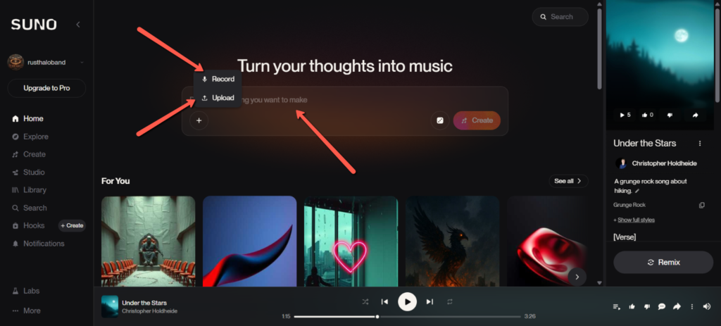 With apps like Suno , this is the reality we live in today. You can describe a song, write some lyrics, upload a riff on your guitar, and it will transform it into the next big hit. I signed up and created four songs already.